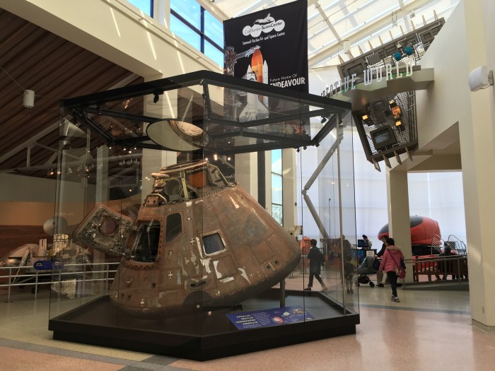 Since 2005, the capsule was displayed in a curved Plexiglass case at the Science Center, on loan from the Smithsonian. After 13 years on public display, it sustained damage—like a large crack in front of the open hatch door—and needed replacement. But in that time, the Smithsonian set new conservation requirements to protect the capsule. Therefore, we built this new six-sided case for Apollo to meet those requirements and give our guests a clearer view of the artifact. We also hung a mirror above the capsule to help guests see into the docking tunnel where Americans greeted Russians in space for the first time in 1975.
